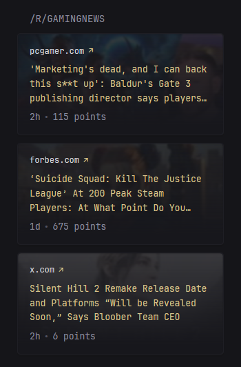 ```yaml define: - &subreddit-settings type: reddit collapse-after: 5 pages: - name: Home width: wide columns: - size: full widgets: - type: split-column max-columns: 5 widgets: - subreddit: selfhosted <<: *subreddit-settings - subreddit: homelab <<: *subreddit-settings - subreddit: linux <<: *subreddit-settings - subreddit: sysadmin <<: *subreddit-settings - subreddit: DevOps <<: *subreddit-settings - subreddit: Networking <<: *subreddit-settings - subreddit: DataHoarding <<: *subreddit-settings - subreddit: OpenSource <<: *subreddit-settings - subreddit: Privacy <<: *subreddit-settings - subreddit: FreeSoftware <<: *subreddit-settings ```